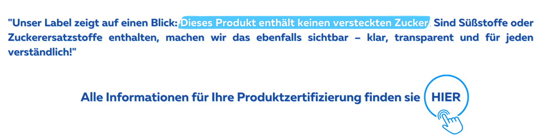 Ist nur zulässig, wenn das Produkt keine zugesetzten Süßmacher enthält. Dieses Siegel wird vergeben, wenn weder Zucker, Süßstoffe noch ein Zuckerzusatz verwendet oder beinhaltet ist. Das heißt, es dürfen keine Mono- oder Disaccharide (z.B. Traubenzucker, Glucose, Fruktose, Maltose, Saccharose) oder andere Zutaten mit süßender Wirkung (z. B. Fruchtsüße oder Fruchtsirup) verwendet worden sein.